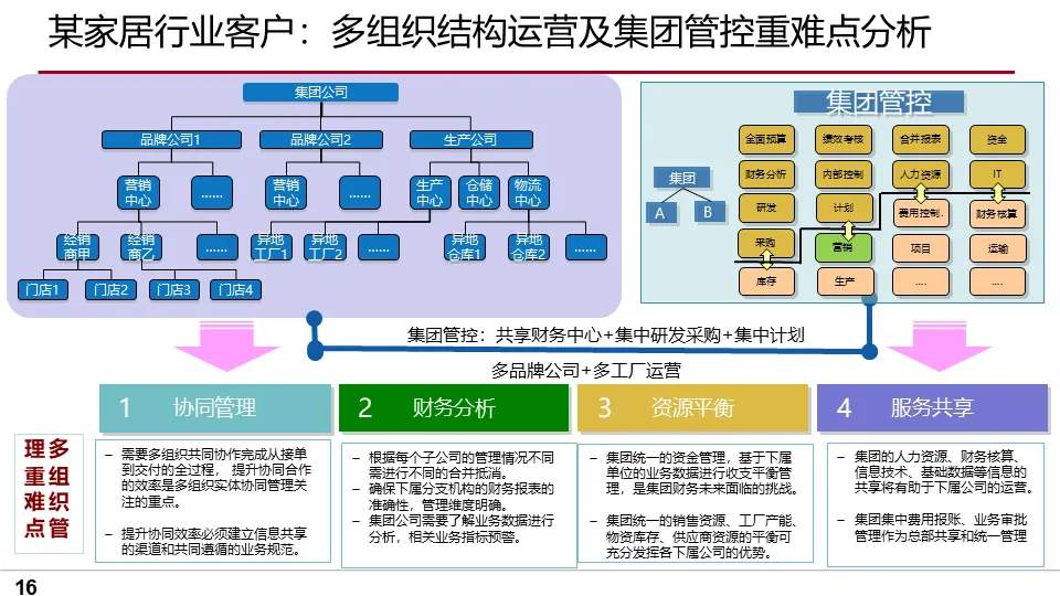 管理诉求痛点:集团化管控需求强烈,需实现多组织独立核算与合并报表自动生成;需支撑规模化生产与个性化定制并行的业务模式,平衡标准化与灵活性;需通过数据驱动决策,实现对销售、生产、供应链等环节的精细化管控。