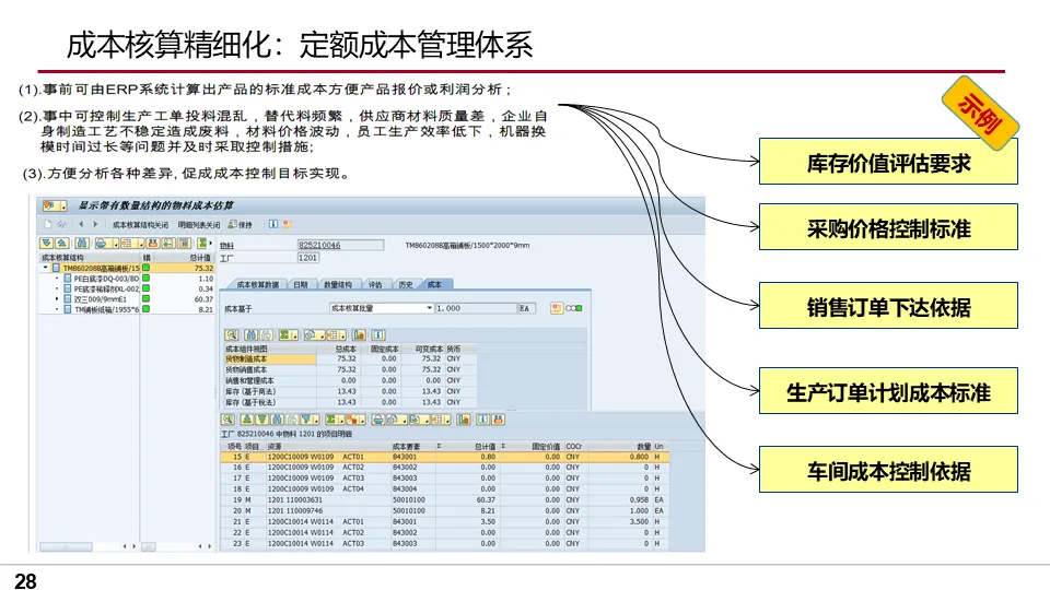 实现财务业务一体化,销售发货、生产领料、采购收货等业务自动触发财务凭证,减少人工干预。构建多组织核算体系,支持按分厂、销售区域、产品类型等维度独立核算与自动出具报表,实现内部交易自动抵消与合并报表生成。成本管理采用精细化核算模式,按产品、车间、工序维度归集料工费,通过标准成本与实际成本对比分析,识别成本差异与优化空间;集成 EPM 预算与费控系统,实现集团全面预算管理与费用实时监控。