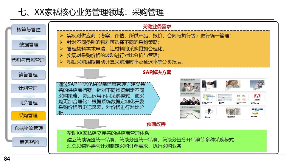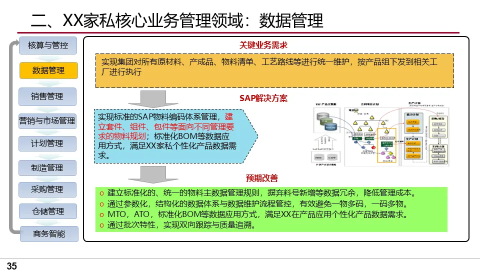 本材料聚焦家具行业规模化、集成化发展趋势下的数字化转型需求,围绕家私多组织、多品类、产销协同的业务特点,提出以 SAP 为核心的全价值链数字化解决方案,涵盖基础数据管理、销售营销、计划生产、采购仓储、财务核算、商务智能等核心领域,通过 “总体规划、分步实施” 的策略,打通从订单到交付的端到端流程,解决数据不统一、产供销协同弱、管控粗放等痛点,最终实现业务集成、数据透明、智能管控与决策支持,助力企业降本增效、强化集团管控能力。