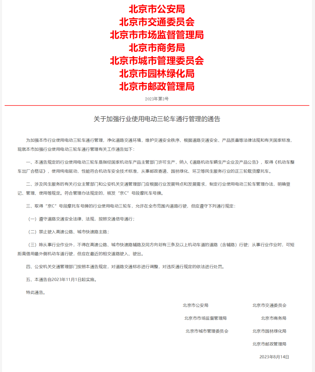 一、本通告规定的行业使用电动三轮车是指经国家机动车产品主管部门许可生产,纳入《道路机动车辆生产企业及产品公告》,取得《机动车整车出厂合格证》,使用纯电驱动,性能符合机动车安全技术标准,从事邮政寄递、园林绿化、环卫等民生服务行业的正三轮载货摩托车。二、涉及民生服务的有关行业主管部门和公安机关交通管理部门应根据行业发展特点和发展需求,制定行业使用电动三轮车管理办法,明确登记、管理、使用等规定。符合管理办法规定的,核发“京C”号段摩托车号牌。三、取得“京C”号段摩托车号牌的行业使用电动三轮车,允许在全市范围内道路行驶,但应遵守下列通行规定:(一)遵守道路交通安全法律、法规,按照交通信号通行;(三)除从事行业作业外,不得在高速公路、城市快速路辅路及同方向划有三条及以上机动车道的道路(含辅路)行驶;从事行业作业时,可短距离借用最外侧机动车道行驶,但应在最近的相交道路驶入、驶出。四、公安机关交通管理部门按照本通告规定,对道路交通标志进行调整,对违反通行规定的依法进行处罚。■说明:本文由家住石景山编辑整理发布,转载请注明