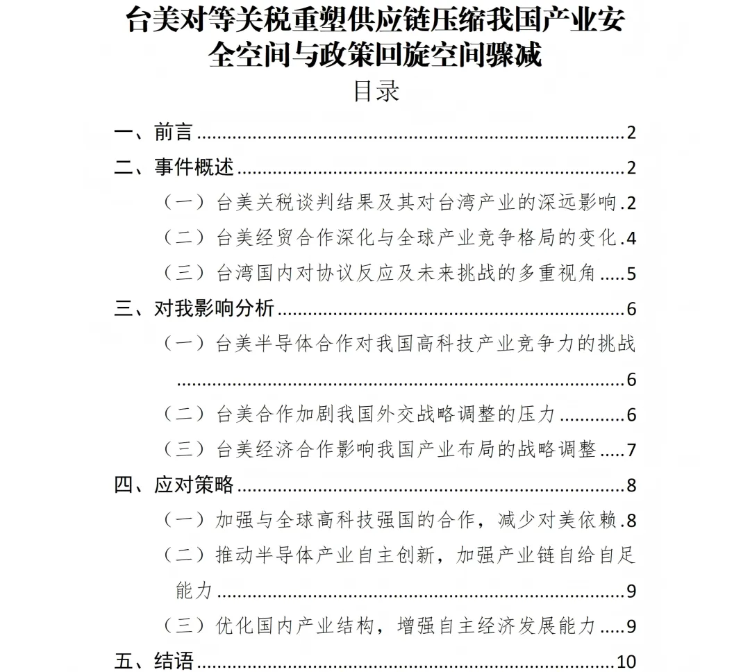 在关税减让的同时,台湾地区半导体与科技企业需对美新增至少2500亿美元直接投资,并由当局提供同等规模信用保证,国台办明确指出,这一组合意味着台湾地区将承担高达5000亿美元承诺及最高约40%半导体供应链向美国转移的风险。台美双方政要、产业界与舆论场围绕关税、投资与供应链的密集表态,实质折射出美国借关税和产业政策重塑区域高科技版图的新阶段,也把台湾地区进一步推向美方产业与安全布局前沿,直接抬升我国在半导体、AI等关键领域所面临的外部挤压与政策不确定性,具有明显的紧迫性与战略敏感度。