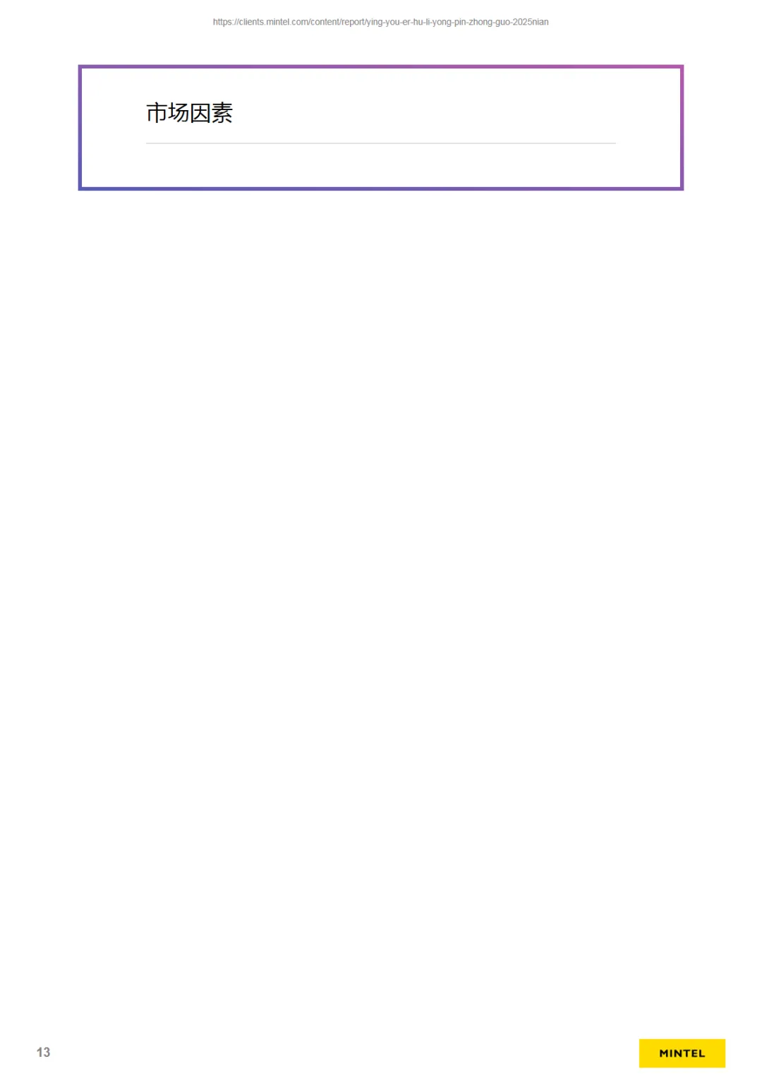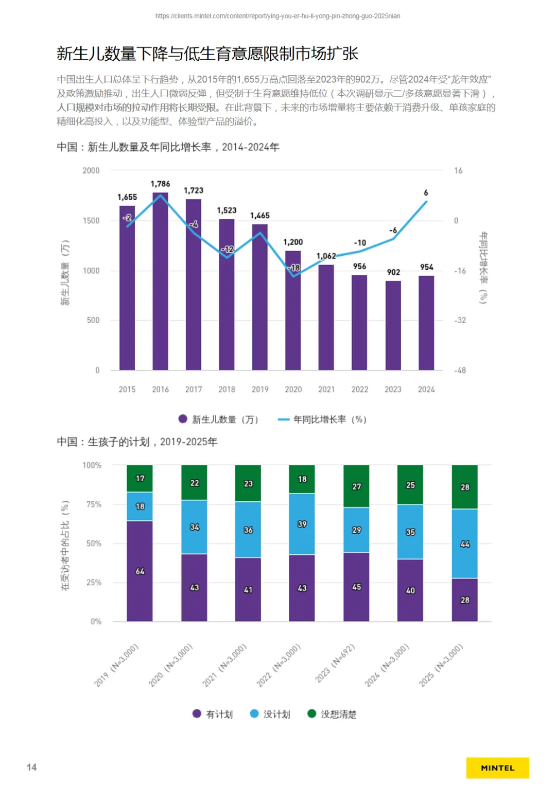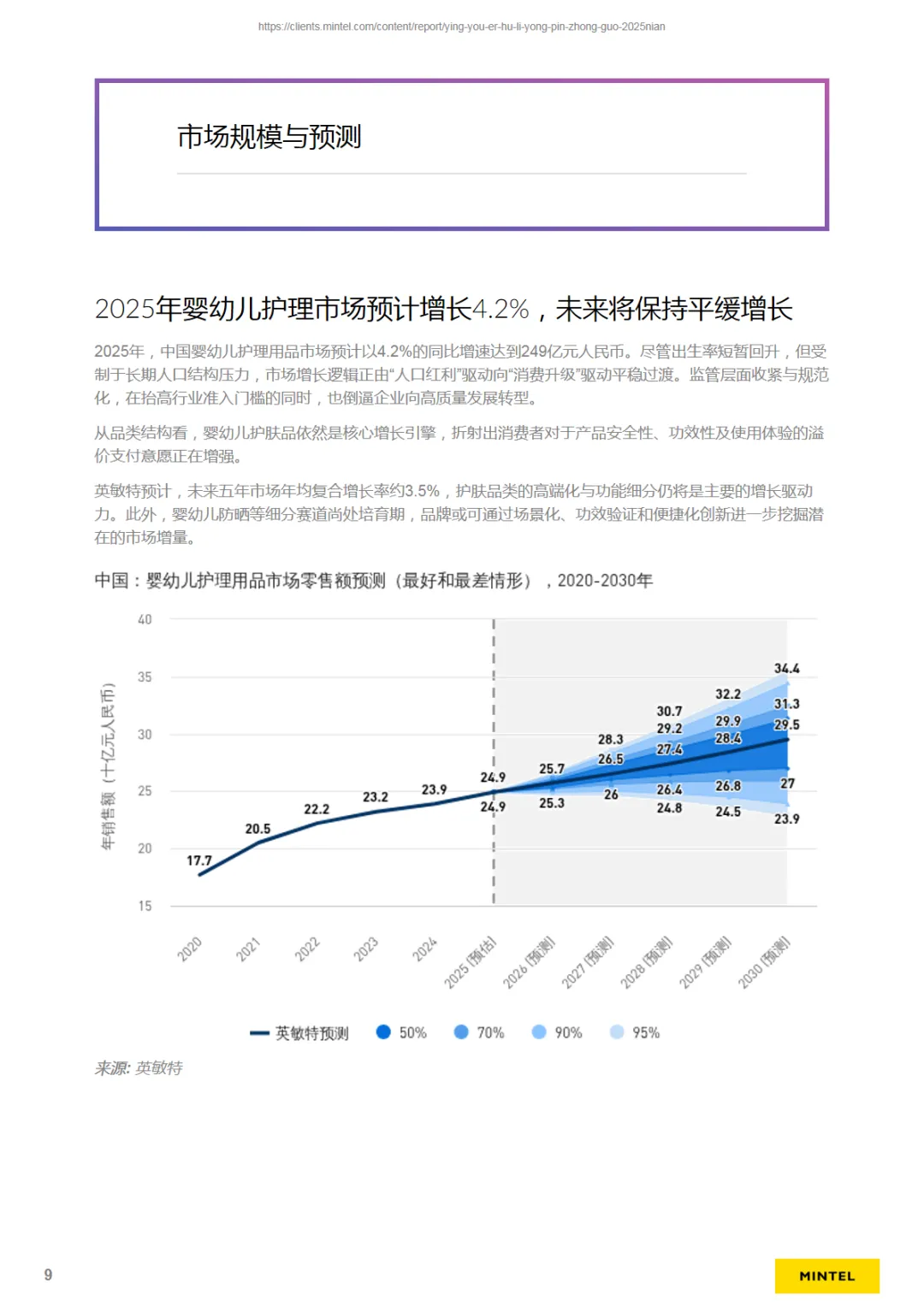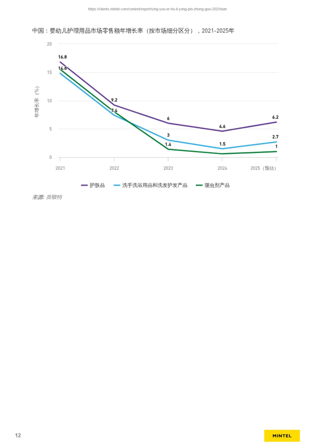 本篇行业报告可以通过扫下方知识星球下载。39元就可以下载星球所有报告。免费提供报告查找服务。随着中国新增人口的放缓,婴幼儿护理用品市场正经历着由规模扩张向价值驱动的转型。2025年,预计市场将以4.2%的增速达到249亿元人民币,显示出尽管出生率短暂回升,但长期人口结构压力下,市场增长逻辑正平稳过渡至“消费升级”驱动。婴幼儿护肤品作为市场的核心增长引擎,其“精细化+高端化”趋势确立,高价位产品占比提升成为核心驱动力。英敏特预计,未来五年市场年均复合增长率约为3.5%,护肤品类的高端化与功能细分将是主要增长动力。此外,婴幼儿防晒等细分赛道尚处培育期,品牌可通过场景化、功效验证和便捷化创新进一步挖掘潜在的市场增量。市场细分方面,婴幼儿护肤品占比稳步提升且增速领先,而基础洗浴、驱蚊品类维持平稳。品牌机会点在于围绕“温和无泪、肤感质地、香氛体验”进行微创新,以获取差异化的结构性增量。新生儿数量下降与低生育意愿限制了市场扩张,中国出生人口总体呈下行趋势,从2015年的1,655万高点回落至2023年的902万。尽管2024年受“龙年效应”及政策激励推动,出生人口微弱反弹,但生育意愿维持低位,人口规模对市场的拉动作用将长期受限。在此背景下,未来的市场增量将主要依赖于消费升级、单孩家庭的精细化高投入,以及功能型、体验型产品的溢价。消费者方面,核心品类渗透率见顶,防晒赛道成为“潜力洼地”。婴幼儿护理产品已进入“存量博弈”阶段,核心品类渗透率保持高位。未来增长逻辑将转向“价值驱动”,通过高端化与功效细分提升客单价与复购。目前,渗透率约40%的防晒品类是唯一尚存的“潜力洼地”,其与主流品类间的认知断层,为品牌通过市场教育截获新客提供了战略突破口。全球市场趋势显示,中国面部护肤占比较高,而英美市场身体护理和洗浴产品占比较高。在洗手及沐浴产品的新品宣称上,中国市场“植物/草本”和“滋润/保湿”宣称占据主导。相比之下,日韩市场则更侧重于“敏感肌适用”和“可持续”等概念。英美市场则更多看到环保和道德类宣称(纯素、动物福利、可回收等)。综上所述,中国婴幼儿护理市场正迎来消费升级与品类创新的新时代,品牌需紧跟市场趋势,通过产品创新和市场教育,把握增长新机遇。免责声明:以上分享报告为公开合法渠道获得,内容大部分来源于网络,版权归原作者所有,如有侵权,请及时与我们联系,我们将第一时间保障您的权益。推荐内容仅供参考学习,不构成投资建议。