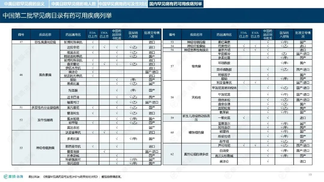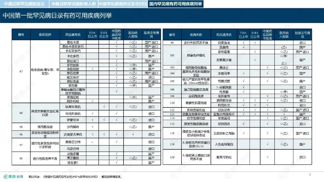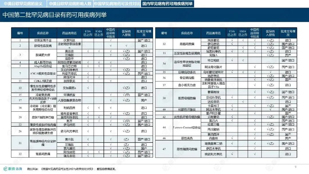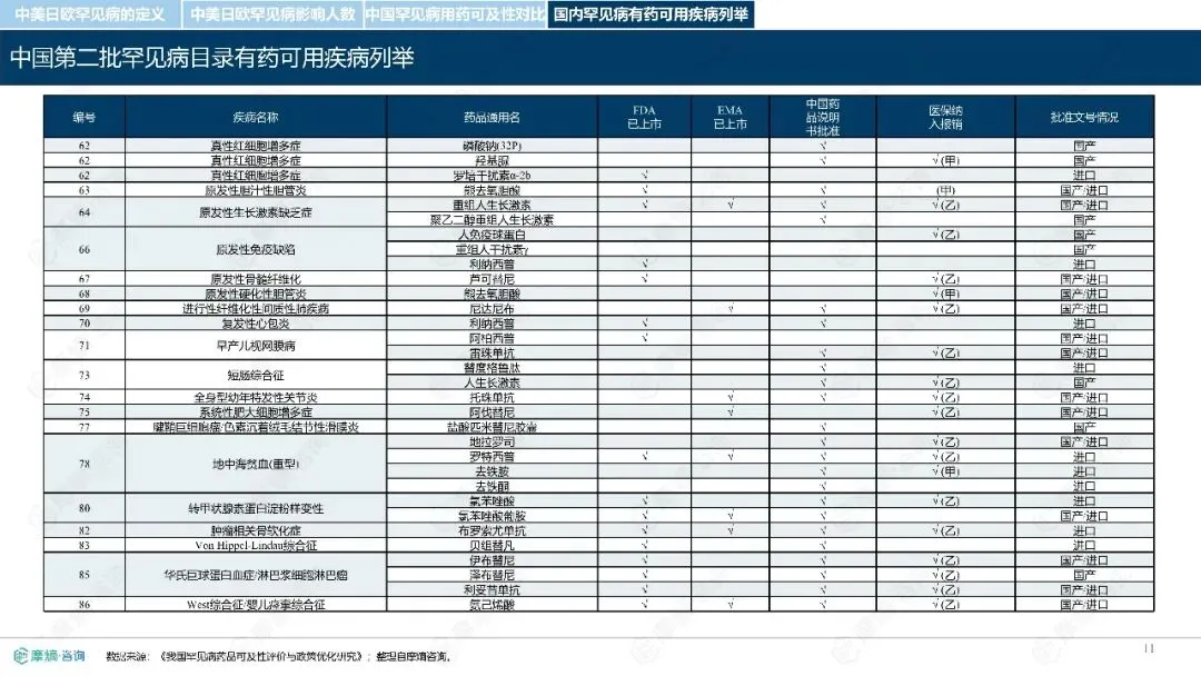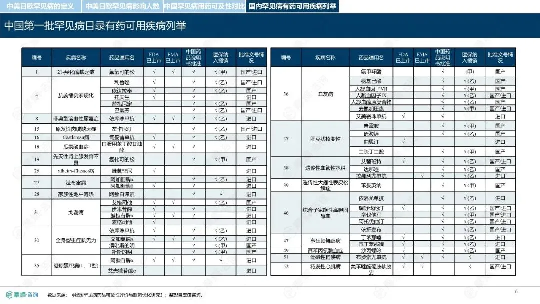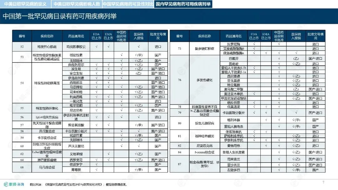 罕见病用药:罕见病的治疗药物也被称为孤儿药(Orphandrug)。罕见病的药物研究成本高昂,受众相对常见病较少,药物开发往往难以回成本,因此仅有少数企业愿意投身罕见病药物的开发,造成了药物种类的稀缺,且罕见病用药价格昂贵,当前,我国罕见病药物的可及性仍处于较低水平