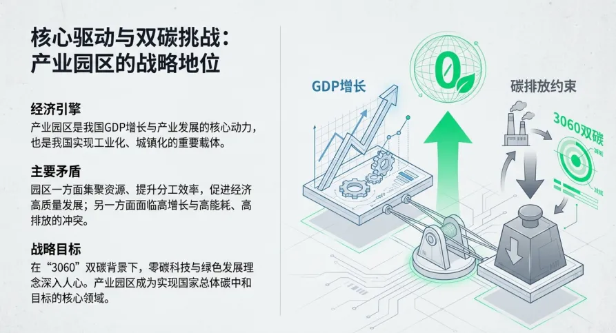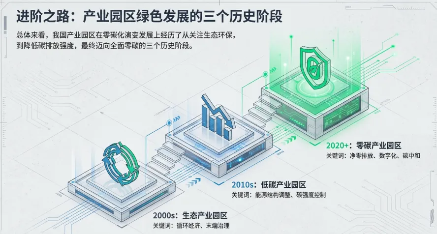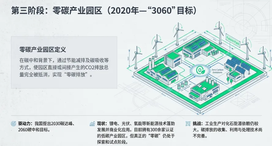 我国产业园区作为 GDP 增长和工业化、城镇化的核心载体,在推动经济高质量发展的同时,也面临高增长与高能耗、高排放的突出矛盾。在 “3060” 双碳目标引领下,产业园区已成为实现国家碳中和目标的关键领域,其零碳化演变历经三个阶段。