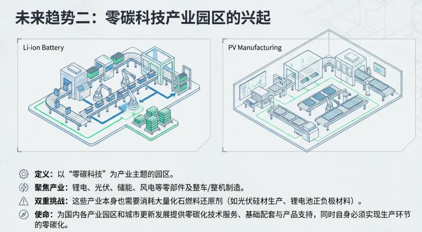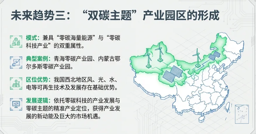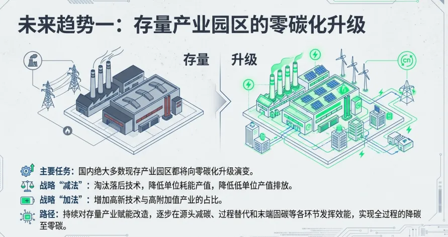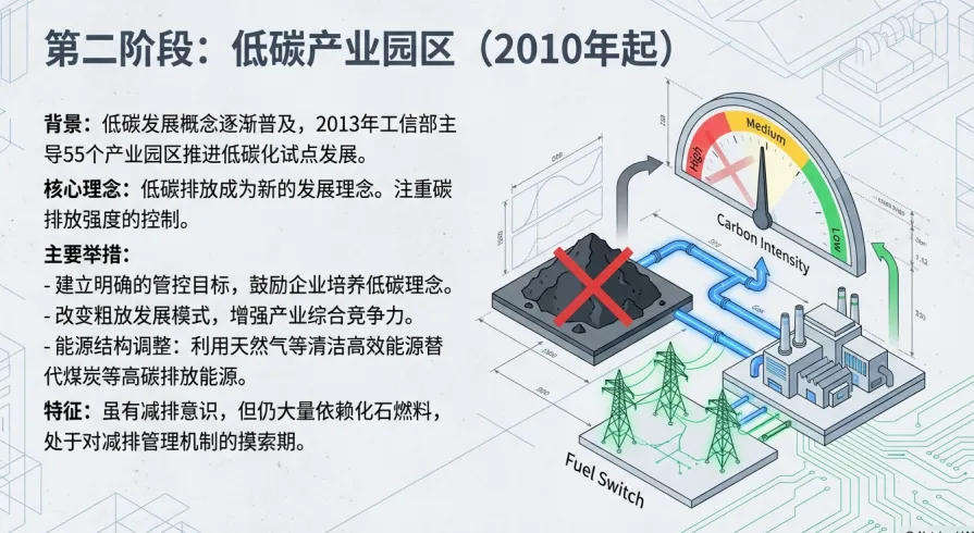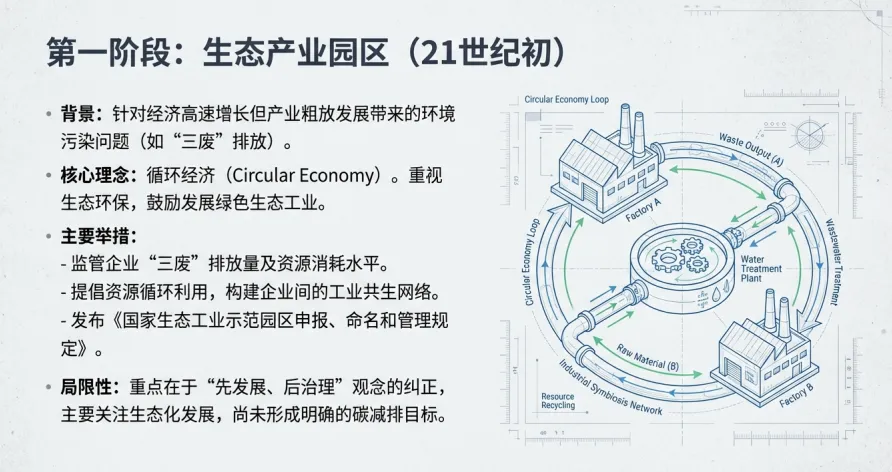 21 世纪初的生态产业园区阶段,以循环经济为核心理念,聚焦 “三废” 治理与资源循环利用,但未明确碳减排目标;2010 年后的低碳产业园区阶段,碳强度控制成为重点,通过能源结构调整等举措推进低碳试点,却仍依赖化石燃料;2020 年起进入零碳产业园区探索期,目标通过节能减排与碳吸收抵消碳排放总量,目前新能源技术商业化应用提速,但 “零碳” 仍处于试点阶段。