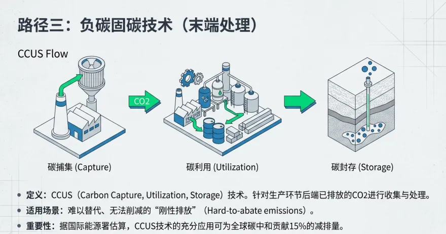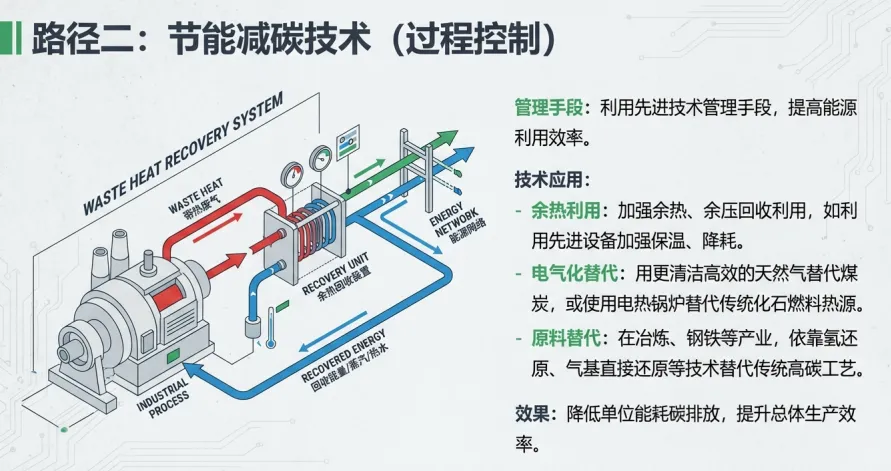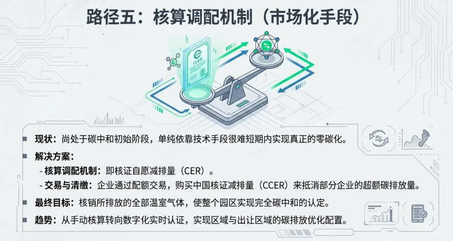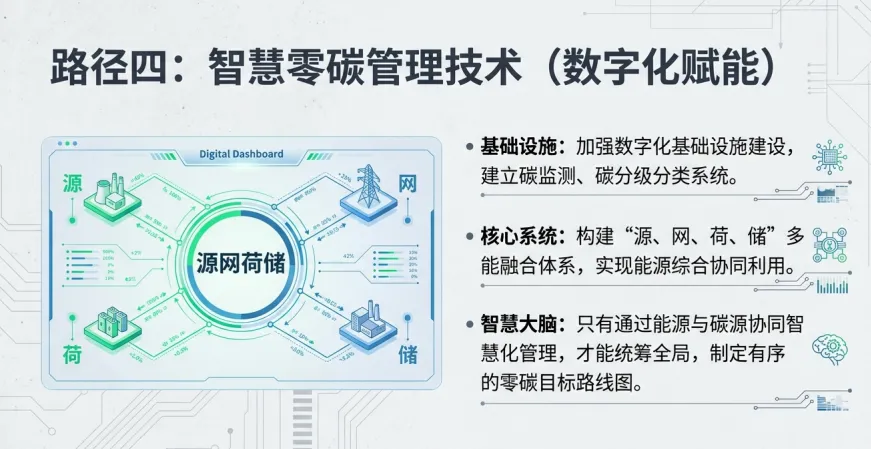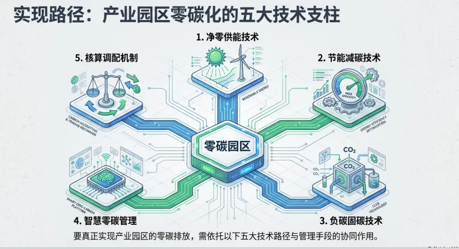 实现零碳化需依托五大技术支柱:净零供能技术以清洁能源替代传统能源,从源头减碳;节能减碳技术通过余热回收、电气化替代等提升能源利用效率;负碳固碳技术聚焦末端 CO₂捕集、利用与封存;智慧零碳管理借助数字化构建多能融合体系;核算调配机制通过 CCER 交易等市场化手段优化碳排放配置。