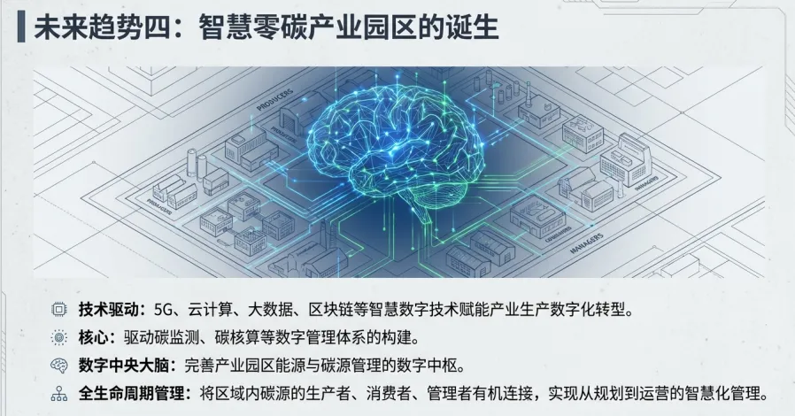 未来,存量园区将通过淘汰落后技术、增加高附加值产业实现零碳升级,零碳科技产业园、“双碳主题” 产业园将逐步兴起,智慧数字技术将全面赋能园区全生命周期零碳管理,推动产业园区在发展中降碳,实现经济发展与绿色低碳的协同推进。