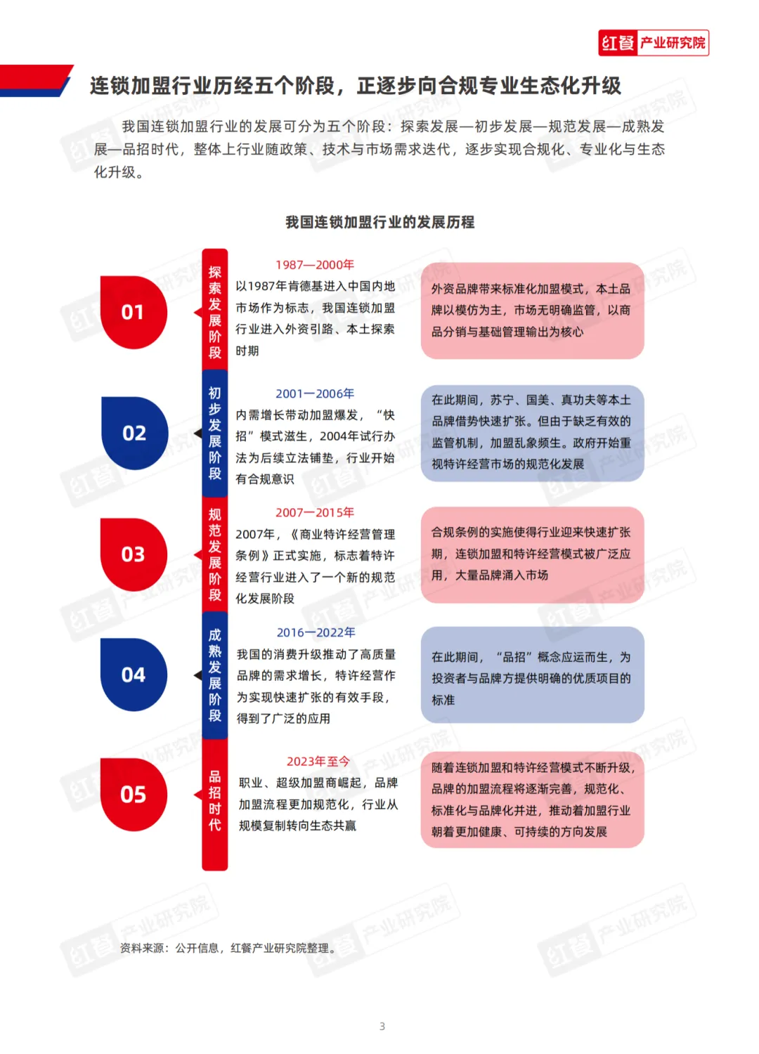 中国连锁加盟行业规模已接近 3 万亿元,历经探索发展、初步发展、规范发展、成熟发展阶段后,步入以 “品招模式” 为主流的新阶段,行业向合规化、专业化、生态化持续升级。政策层面,以《商业特许经营管理条例》为核心,多部门协同监管、行业自律补充,推动监管穿透化、责任一体化、信息透明化。
