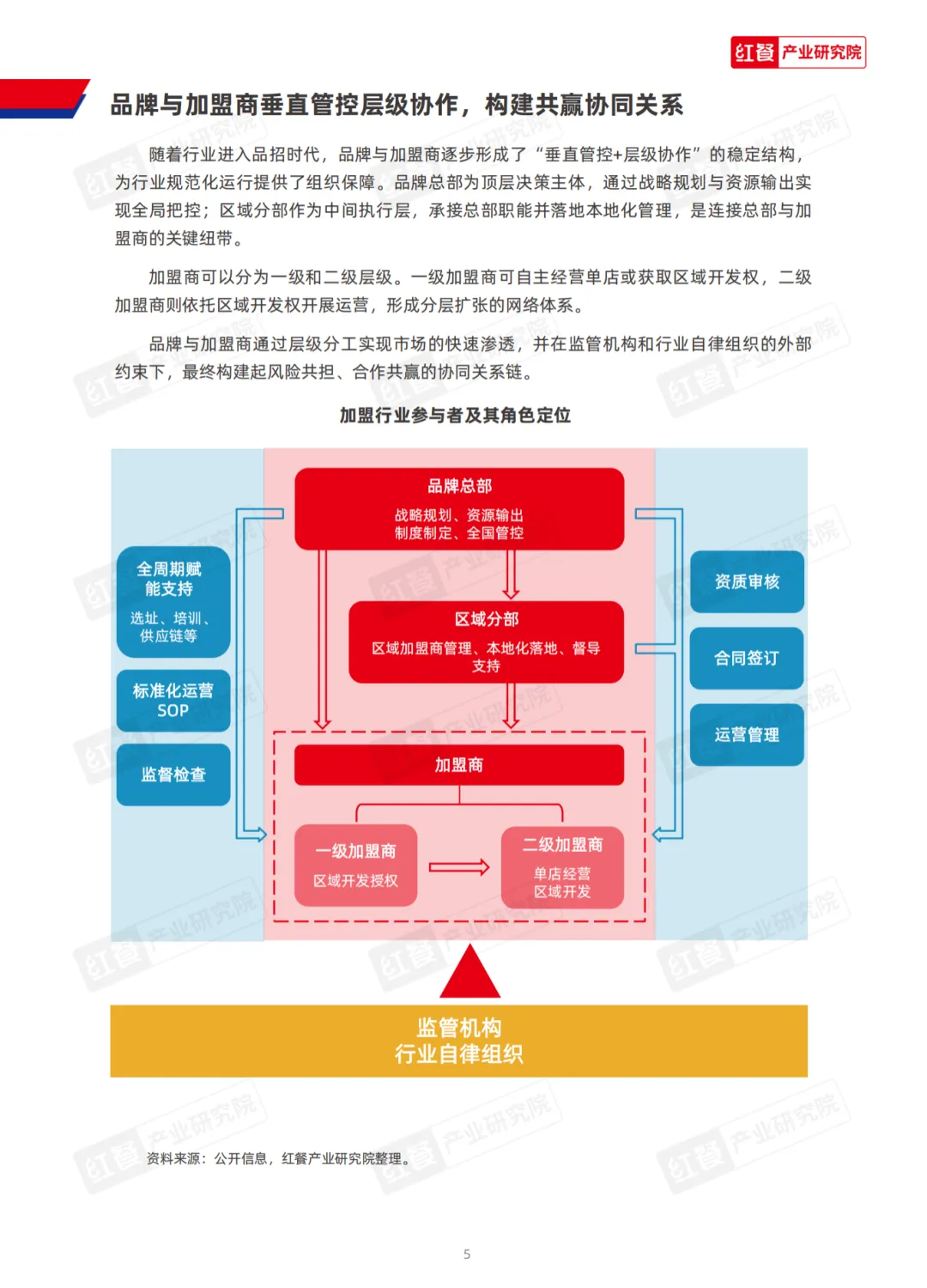 市场结构上,餐饮业占加盟市场近五成,为绝对主力,零售业紧随其后;各行业连锁化率差异显著,零售业以 32% 居首。品牌盈利逻辑从传统加盟费模式转向供应链溢价模式,通过集中采购、物流配送等深度绑定门店经营。加盟商群体中,职业加盟商与超级加盟商崛起为主流,决策更趋理性,聚焦回本周期、行业前景与品牌形象,偏好中等规模投资,餐饮业为首要选择。