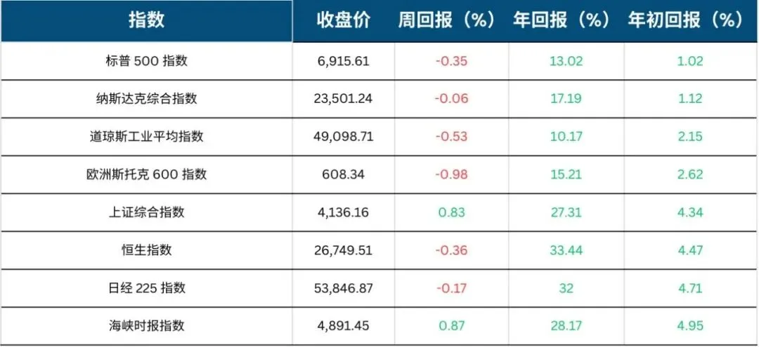 指数 周回报(%) 年初回报(%) 核心表现解读