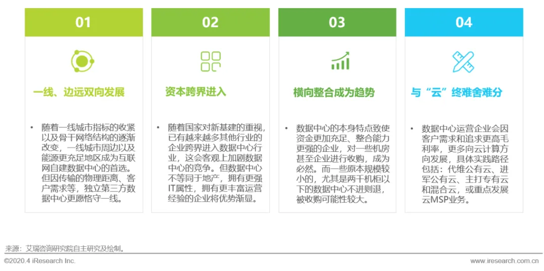 数据中心需求持续增长,但市场竞争也十分激励。从短期看:有不少其他行业企业认为数据中心有更高的毛利率,因此切入该行业;从长期看:云计算对数据中心业务的挑战一直存在。随着大型数据中心和超大型数据中心数量的增多,一线城市中的中小型数据中心虽然地位仍重要,但整体市场占比会逐渐减小,如无其他突围方式,便陷入“不进则退”的处境。资金更加充足、整合能力更强的企业,对一些机房甚至企业进行收购,成为必然。在未来,这种横向资源的整合将会更多发生。