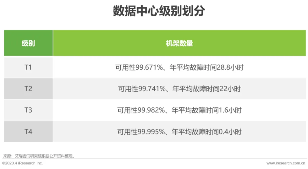 数据中心规模方面,按标准机架数量,可分为小型、大型和超大型。级别方面,常依据Uptime Institute的行业评判标准,按可用性,分为T1、T2、T3和T4。