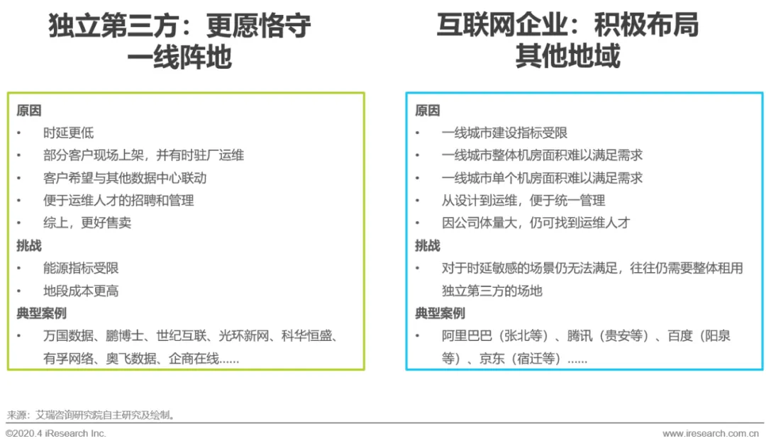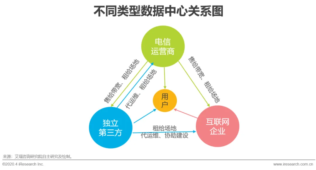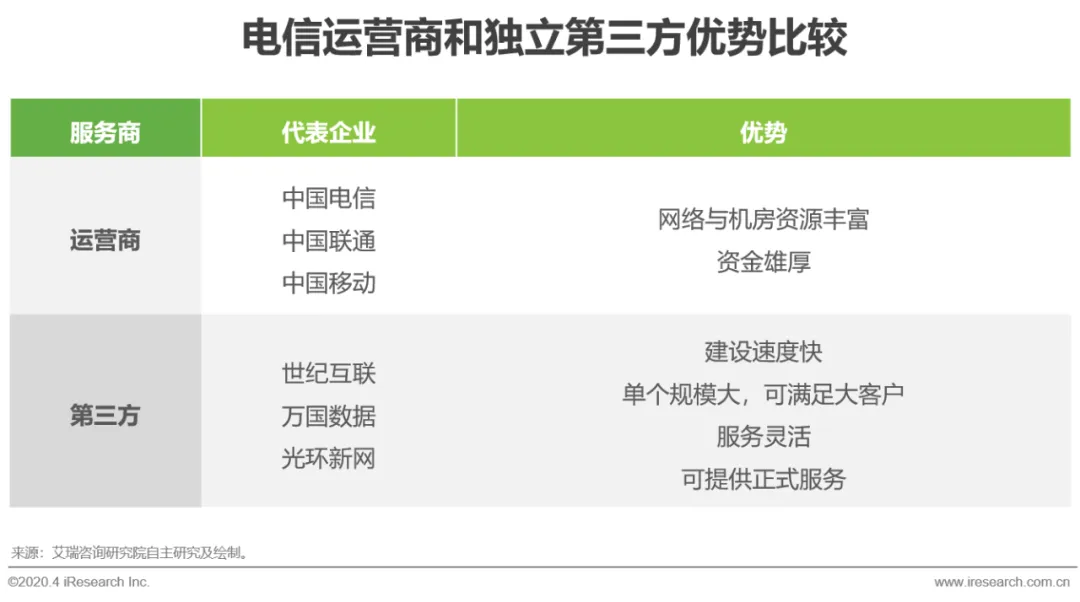 数据中心的主要建设者包括电信运营商,独立第三方和大型互联网企业,三者之间存在着较为复杂的合作关系,在少数场景下亦存在竞争。电信运营商的核心优势是对带宽等资源的垄断、广泛分布的机房,以及深入到县级以下的体系。独立第三方的核心优势是丰富的建设经验和运维经验。互联网公司的核心优势是自身使用,因此可以统一规划、设计,并做全部的虚拟化、云化处理。互联网公司对于新技术的运用往往更加彻底,但在数据中心本身的产业链中,其作为买方,不参与市场竞争(其出售给下游的一般为云产品)。相比于电信运营商,独立第三方因建设速度、服务模式和重视程度等原因,优势渐显。
