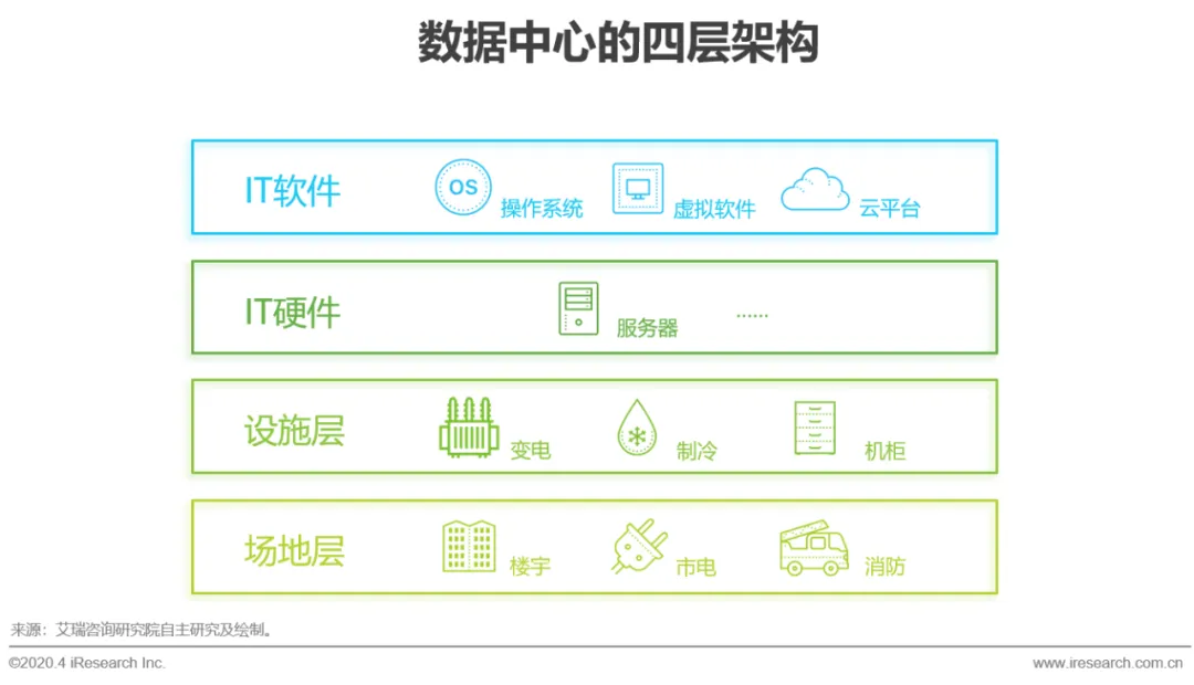 数据中心具有房地产和IT的双重属性,其可从场地到IT软件分为四层,每上升一层其地产属性会更弱、而IT属性会更强。大多数的数据中心到设施层即止。在客户类型为大客户,选择自行接入网络,或者服务商无网络资质时,也不提供网络服务,是更加简单的DC而非IDC。提供IT硬件时,业务即开始向服务器租用转变。提供IT软件时,一般即转型为公有云或者专有云的云厂商。