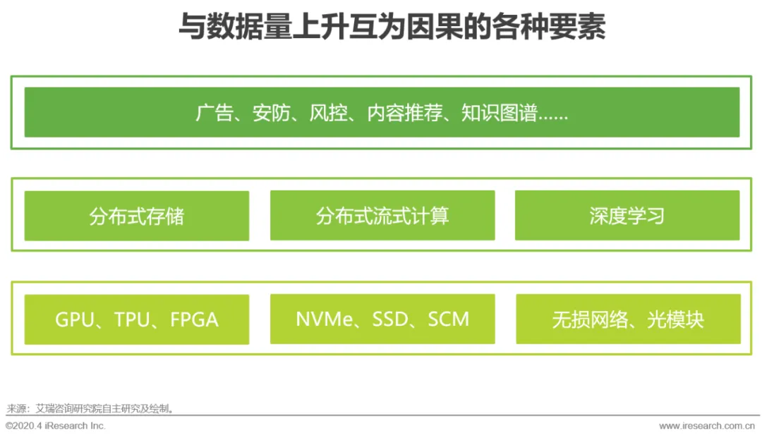 云计算、大数据和人工智能的快速发展,使得数据成为一种资产:过去用完即弃的日志数据,以及其他大量的非结构化、半结构化数据可以得到存储和分析。流式计算和深度学习,使得这些数据能够实时计算并指导从生产到销售的各个环节。GPU、TPU、FPGA等芯片技术,SSD、NVMe等存储技术,100G、400G光模块等网络技术,都提供了更为基础的保障。这些要素共同促进了计算、存储和传输的数据进一步上升。