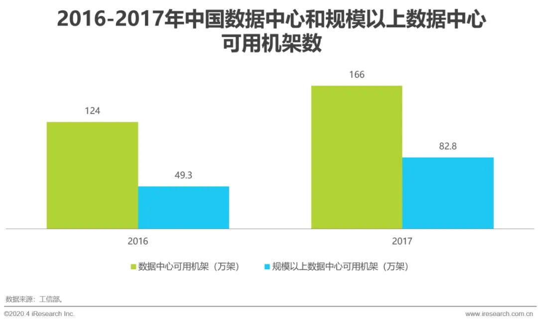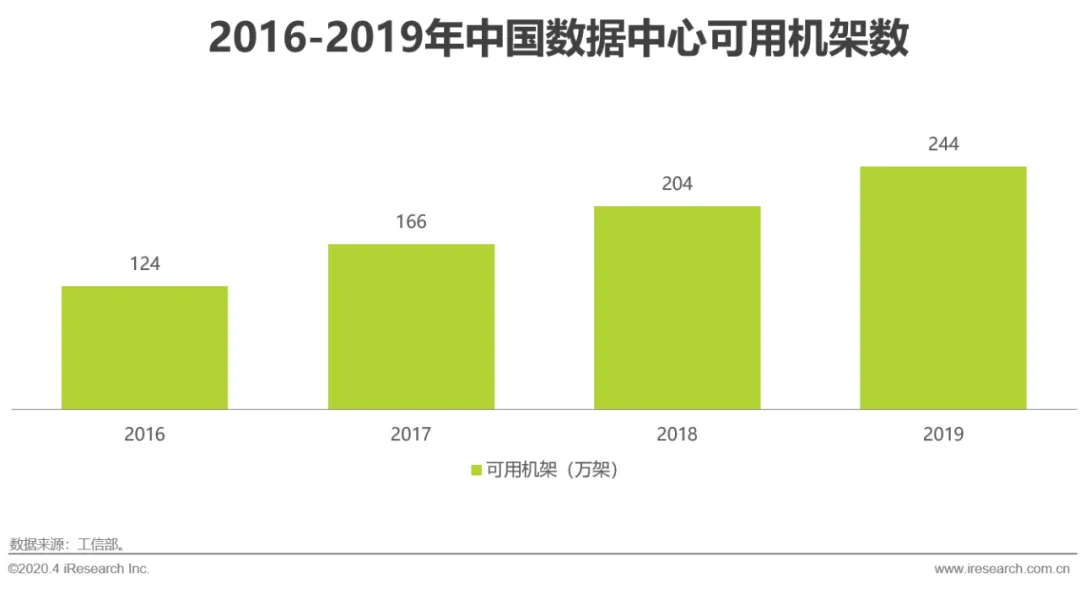 截至2017年年底,我国在用数据中心的机架总规模达到了166万架,与2016年年底相比,增长了33.4%。超大型数据中心规模达到28.3万架;大型数据中心机架规模达到54.5万架。根据估算,2019年,我国数据中心机架总规模可达244万架。