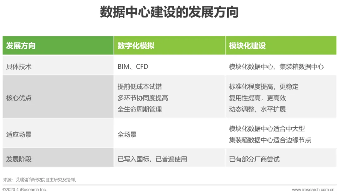 模块化是数据中心建设的另一趋势,模块为集成了供配电、制冷、机柜、综合布线、动环监控等功能独立的运行单元,实现了数据中心建设从工地到工厂的转移,具有稳定性高、快速部署、分期建设、动态调整和水平扩展等优点。