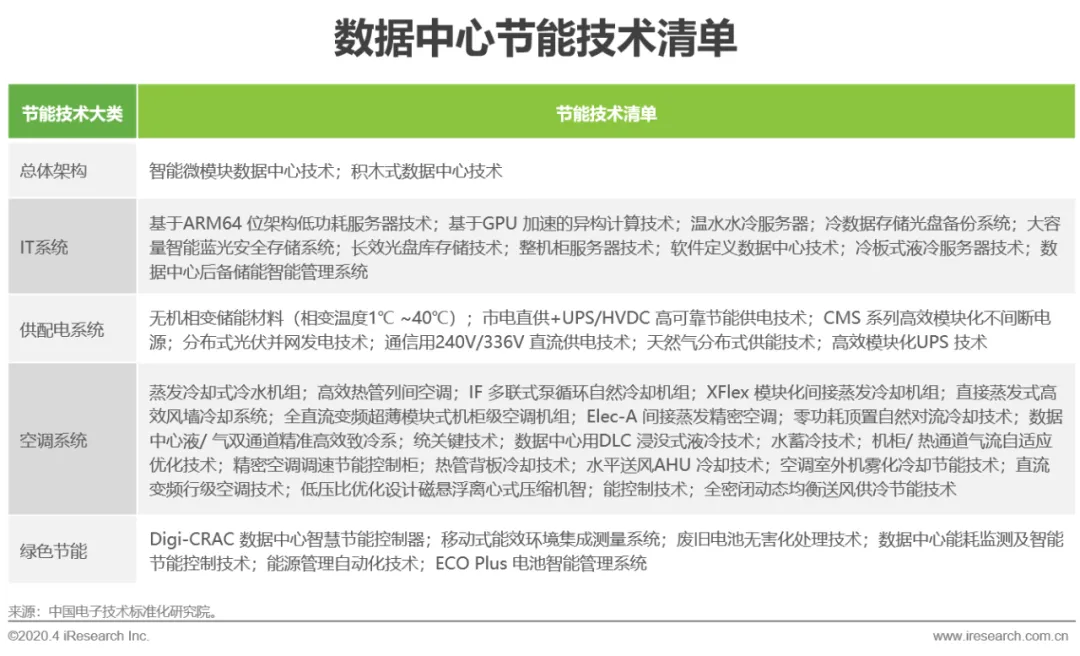 近几年,北上广深分别颁布了对数据中心PUE的新规定,政策趋紧。数据中心节能技术众多,可分为整体架构、IT系统、供配电系统、空调系统和绿色节能等几大类。这些技术,有些已经大范围落地,有些因为成本、稳定性和客户需求等原因,仍然处于探索阶段。以革命性的浸没式液冷为例,独立第三方数据中心因托管的是客户的服务器,因此很难进行这项改造。不过,随着GPU服务器比例的逐渐增多,在原有体积下,风冷完全无法满足冷却需求,此时,液冷便会成为刚需而逐渐普及。