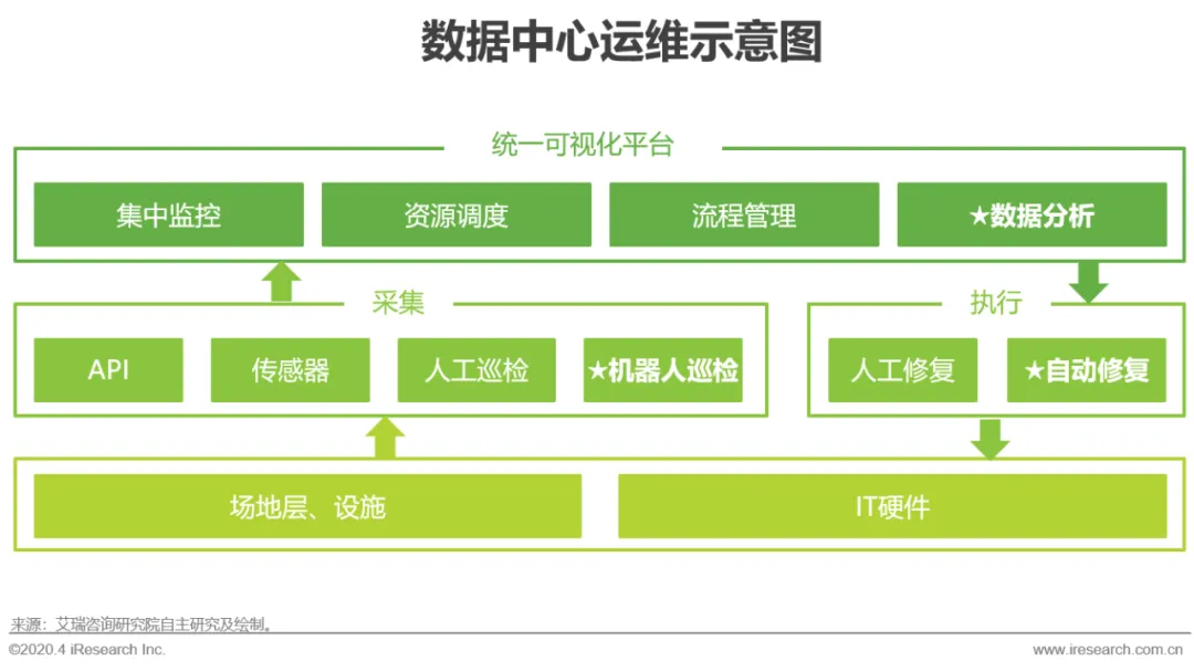 随着业务系统的快速上线、灵活伸缩以及更高的SLA要求,再加上有限的IT运维成本,运维的要求越来越高。而随着数据中心规模的越来越大,单靠人工很难满足运维需求,从“管理”向“研发”转变的自动化运维成为发展方向。具体包括统一化、可视化的DCIM和智能运维。DCIM,即数据中心基础设施管理 (Data Center Infrastructure management),是通过软件、硬件和传感器等,将IT和设备管理结合起来,对数据中心关键设备进行集中监控、容量规划、资源调配、运维跟踪等集中管理。BIM和DCIM两者结合,可以提供数据中心从设计、建设到投产、运维的全生命周期的管理。智能运维包括两部分:其一为从DCIM平台上,直接采用自动化脚本、深度学习等方式,实现对数据的学习,并进一步预警或者自愈,其二是以巡检机器人代替人工巡检。自动化运维的终极目标是零运维,但这一目标只可逼近难以达到。
