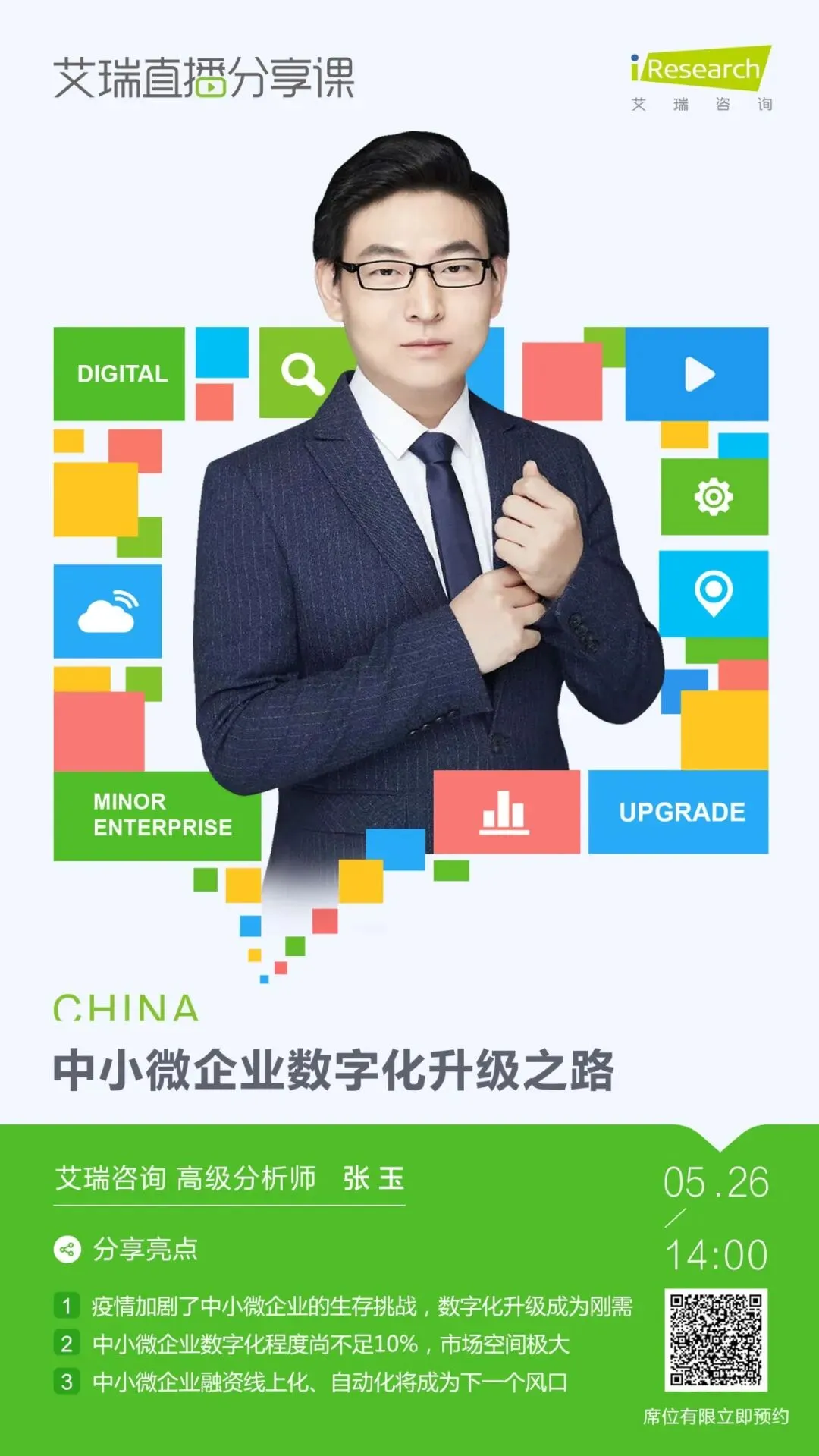 艾瑞咨询基于多年的研究领域经验,推出“艾瑞直播分享课”系列线上直播活动,本期由艾瑞咨询高级分析师张玉,定于5月26日14:00为大家带来“中国中小微企业数字化升级之路“的主题分享。届时将从融资和经营两方面分享如何实现数字化转型之路,期待您的参与~