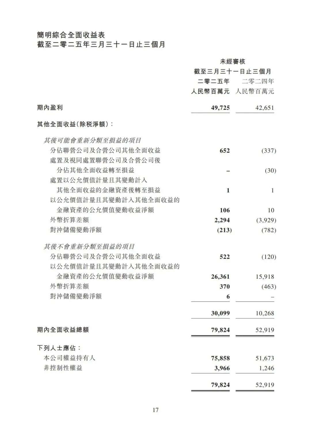 期内盈利(49,725) + 其他全面收益(30,099) = 期内全面收益总额(79,824)