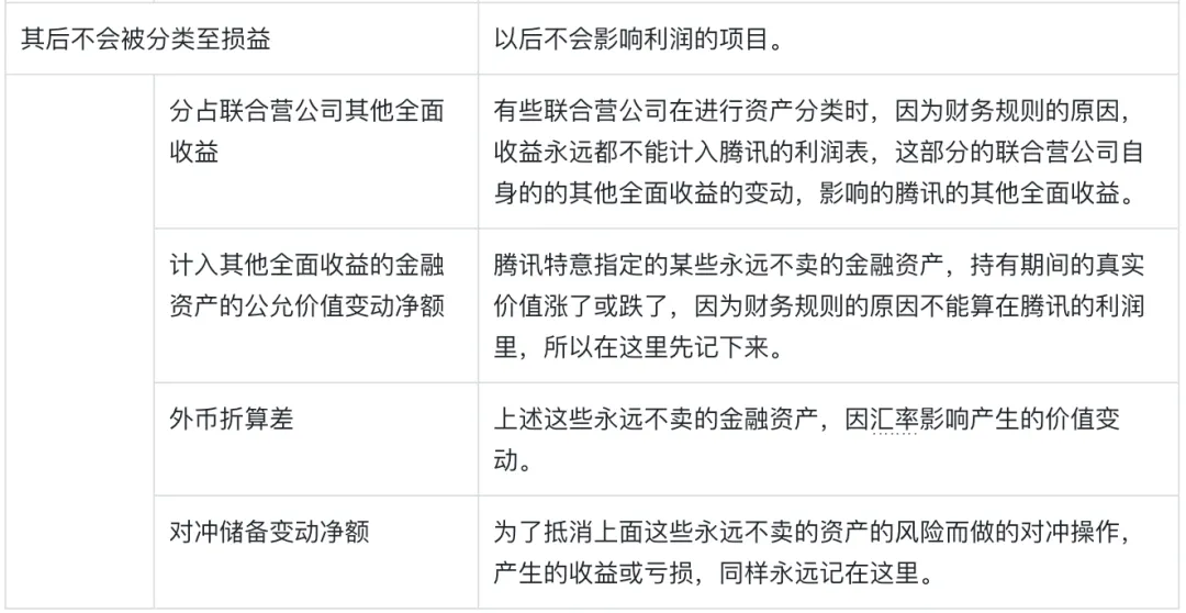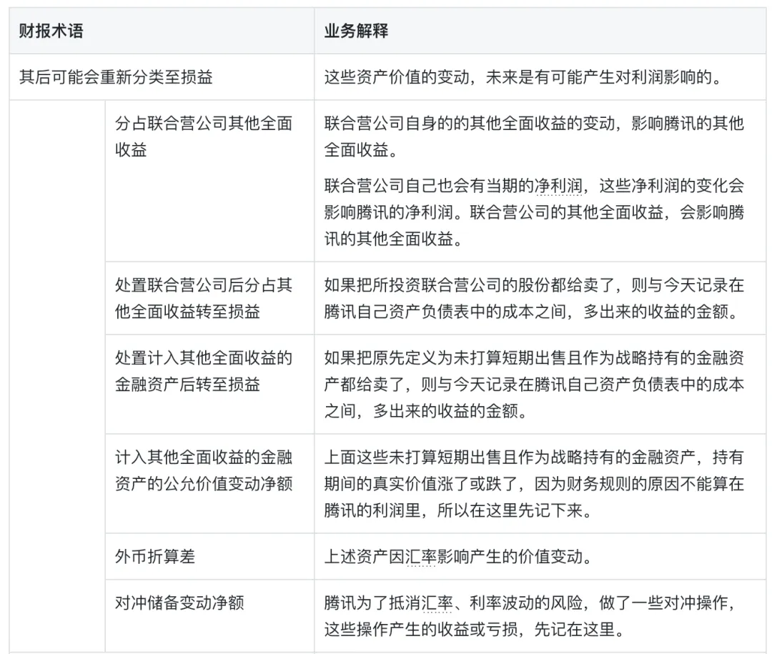原文是“处置及视同处置联营公司及合营公司后分占其他全面收益转至损益”,翻译过来是,当对“联营公司及合营公司”进行了“处置”,或者进行了与处置类似的业务动作之“后”,专业术语叫“视同处置”,这里面原本分类在“其他全面收益”中的数值是要按照财务规则,“转至”利润表中的“损益”中的金额。处置这个动作,是腾讯主动进行的股份售出;视同处置这个动作,是因为被投资公司新发行股份而导致腾讯占比降低,但被投资公司整体估值也会产生变动,所以是腾讯被动接受的一种结果。