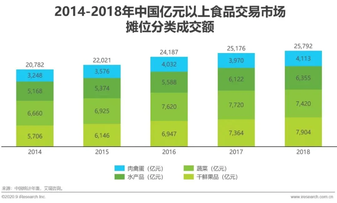 按亿元以上食品交易市场摊位分类成交额口径统计,我国主要生鲜食品品类成交规模由2014年的2.1万亿增长至2018年的2.6万亿,年复合增长率为5.5%。其中,干鲜果品交易额的增速最快,与居民生鲜食品消费情况相符,表现出居民的食品消费由生活必须的食物向更高品质、多样化的消费结构升级的趋势。