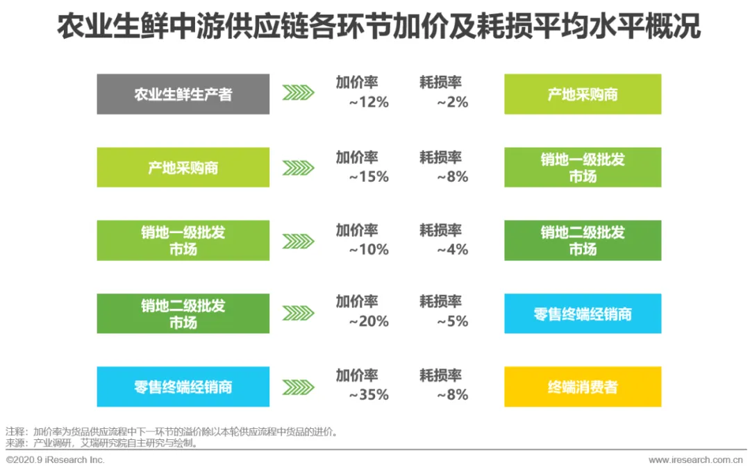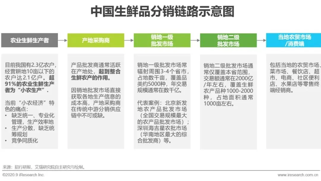 由于上游生产的时空分布不均,我国生鲜品目前需要依赖多级产销地批发市场实现全国范围内的分销流通。其中,产地采购商起到整合当地生鲜农产的作用,辐射范围相对较小。而销地批发市场通常交易规模较大,能够辐射省级地理区域。各级批发市场的规模悬殊使得各环节的流通速率、储存条件大相径庭,而繁琐的链条削弱了从业者的盈利能力,限制了从业者改善前述经营条件的能力。同时,由于生产者与消费终端相隔多层分销环节,生产者通过提升品质、建设品牌从而建立终端竞争力的能力也受到大幅限制。