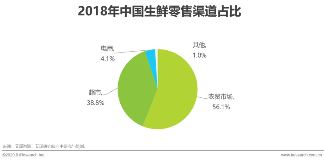 结合公开资料估算,2018年农贸市场在我国生鲜零售渠道中占比为56.1%,超市为38.8%,电商渗透率为4.1%,其他渠道如便利店、个体商贩占比约为1%。