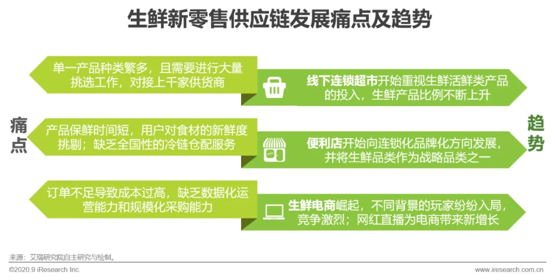 连锁超市与便利店一方面在逐步替代农贸市场成为生鲜零售渠道的主导,一方面也在生鲜电商的影响下开始了对新零售业态的探索。然而,各类下游生鲜零售渠道缺乏全方面的冷链物流能力和供应链生态,而传统的生鲜供应链企业也不具备C端的服务能力,故大多商超以原有的线下门店加到家配送服务的形式构建新零售方案,导致履约成本偏高。