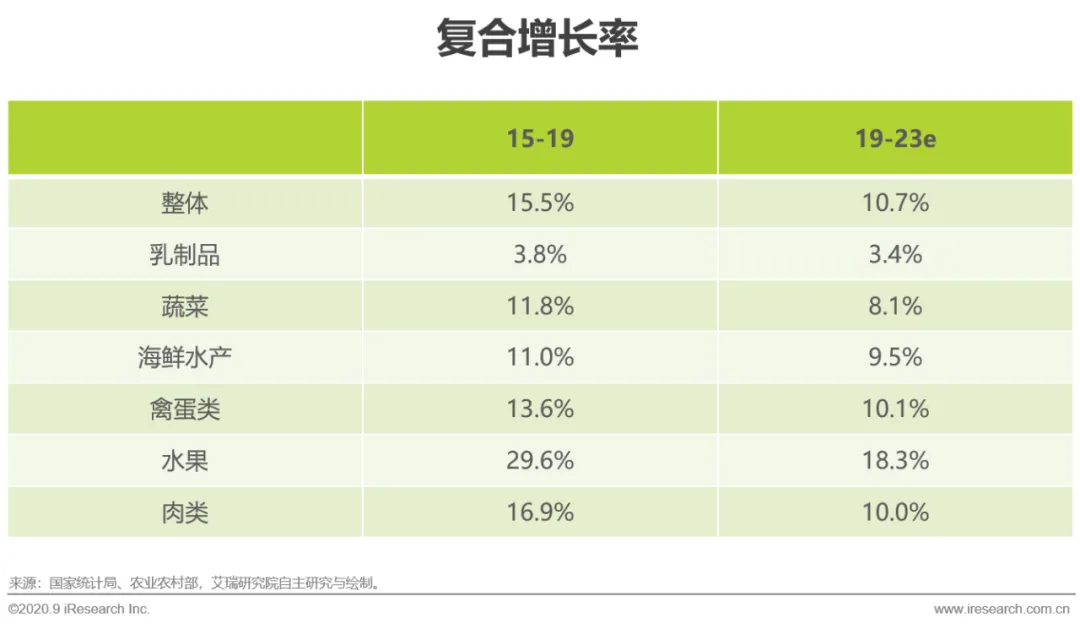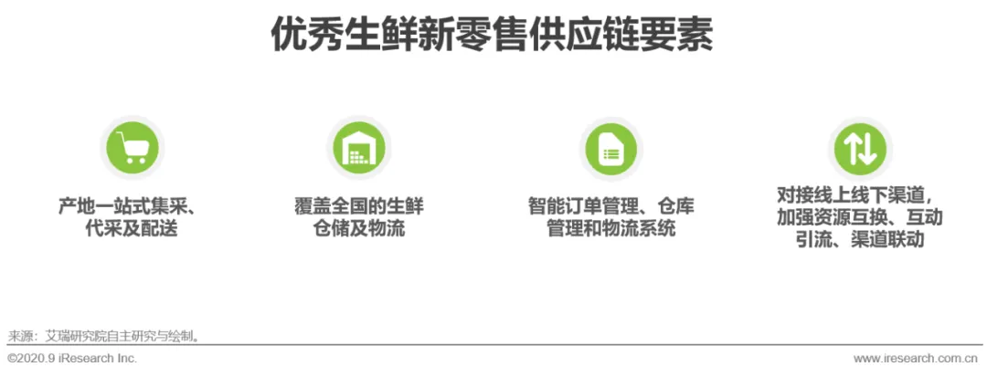 农业作为供应链最源头的供给端,提供了肉禽、蔬菜、水果、海鲜等生鲜产品。生鲜产品具有鲜活易腐、不耐贮运、生产季节性强、消费弹性系数小等特点。随着生鲜供应链的逐渐成熟,生鲜产品的运输季节、地域限制被克服。