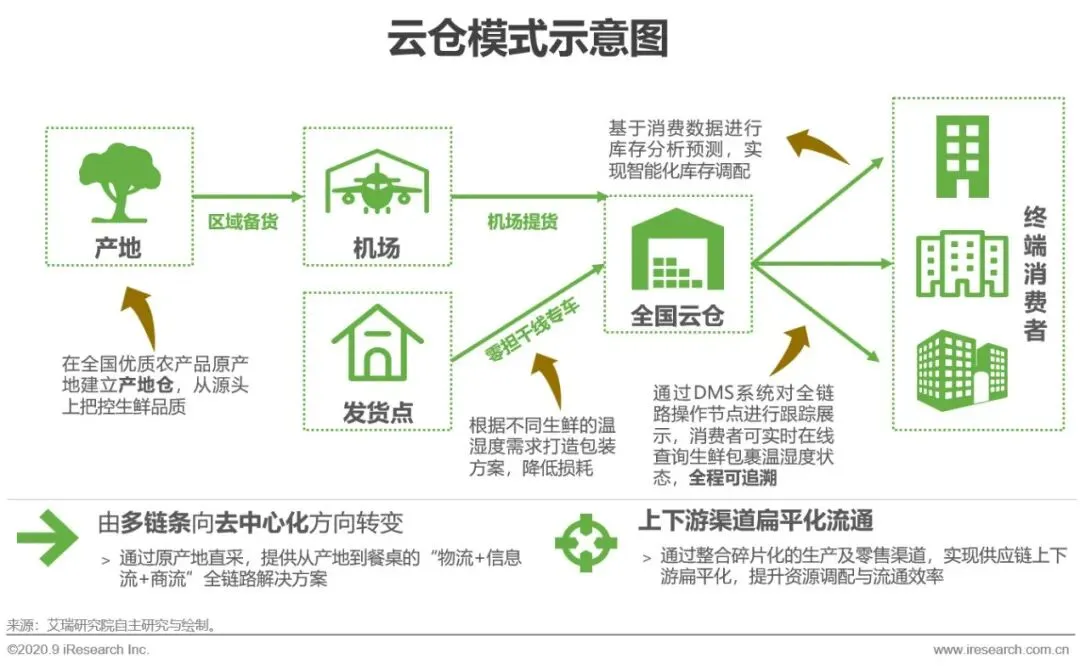 传统生鲜供应链企业大多是2B模式,服务于餐饮、超市、加工厂等,不具备2C端的服务能力。因此,生鲜新零售玩家必须依靠自身额外建立2C端服务资源。这种供应链两端的分立导致全链条上的资源与数据不能充分整合利用,因而效率始终无法得到有效提升。针对这一痛点,新型的云仓模式应运而生,新型供应链服务商通过整合全国范围内的产业链资源,形成生鲜供应链平台,从而实现了从产地至终端消费者的一站式生鲜供应链解决方案。