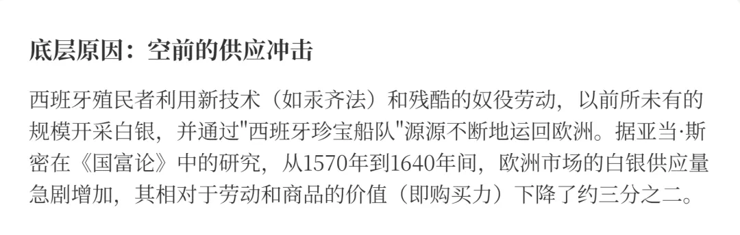 这场由白银供应过剩引发的物价普遍上涨,在历史上被称为"价格革命"。欧洲各国的食品、土地和各类商品价格持续飙升,对社会结构产生了深远影响,加速了封建制度的瓦解和资本主义的兴起。这本质上是白银的一次长达百年的熊市周期——不是名义价格下跌,而是其实际购买力的持续侵蚀。