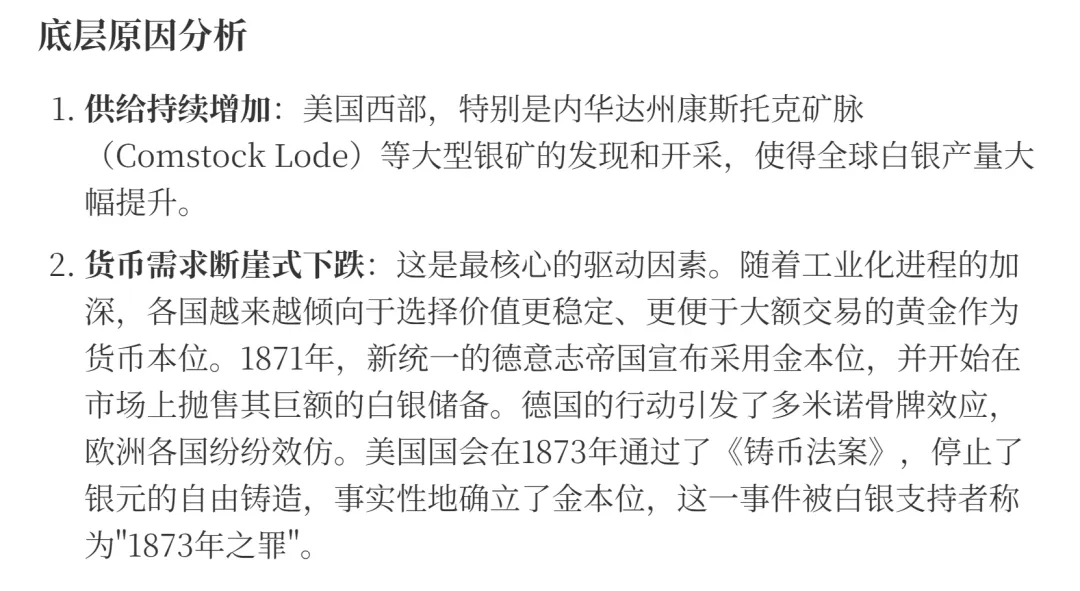 从19世纪中期开始,尤其是1870年代之后,白银价格经历了一场无可逆转的长期下跌。其底层原因并非单一的,而是供给增加和需求锐减的致命组合。