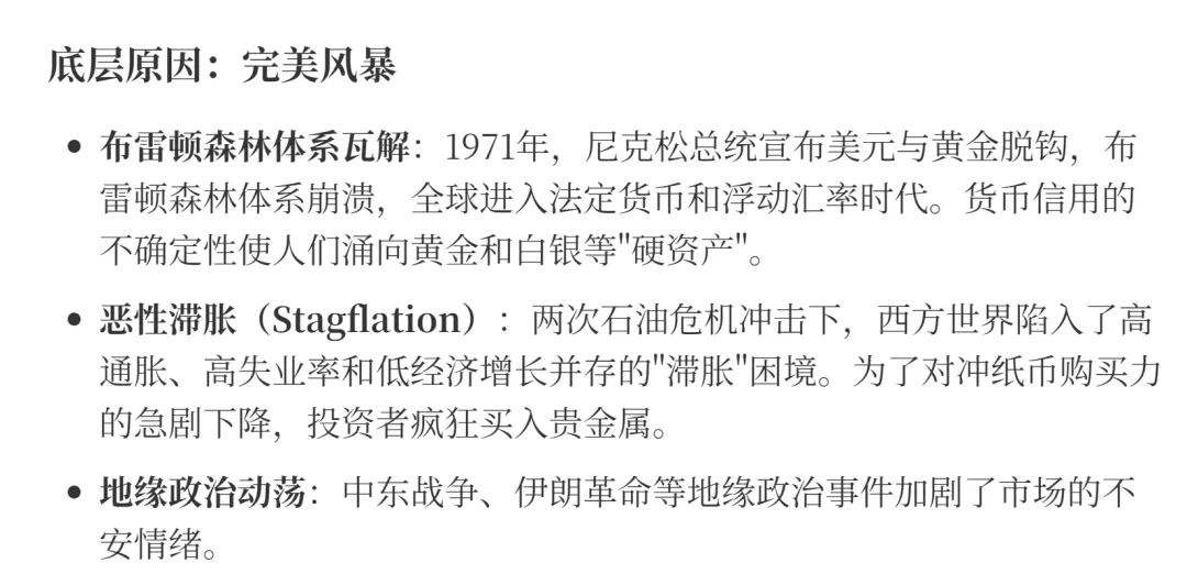 白银的货币史终结之日,恰恰是其金融属性以另一种形式爆发的开始。1970年代的全球经济环境为贵金属创造了完美的风暴。