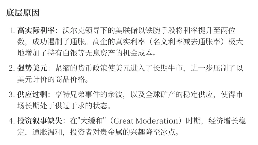 监管机构和交易所随后出台了严格的交易限制("只许平仓"规则),加上美联储主席保罗·沃尔克开始实施激进的紧缩货币政策,最终刺破了泡沫。银价在短短两个月内暴跌超过80%。亨特兄弟破产,白银市场也因此次重创,开启了长达20年的漫长熊市。