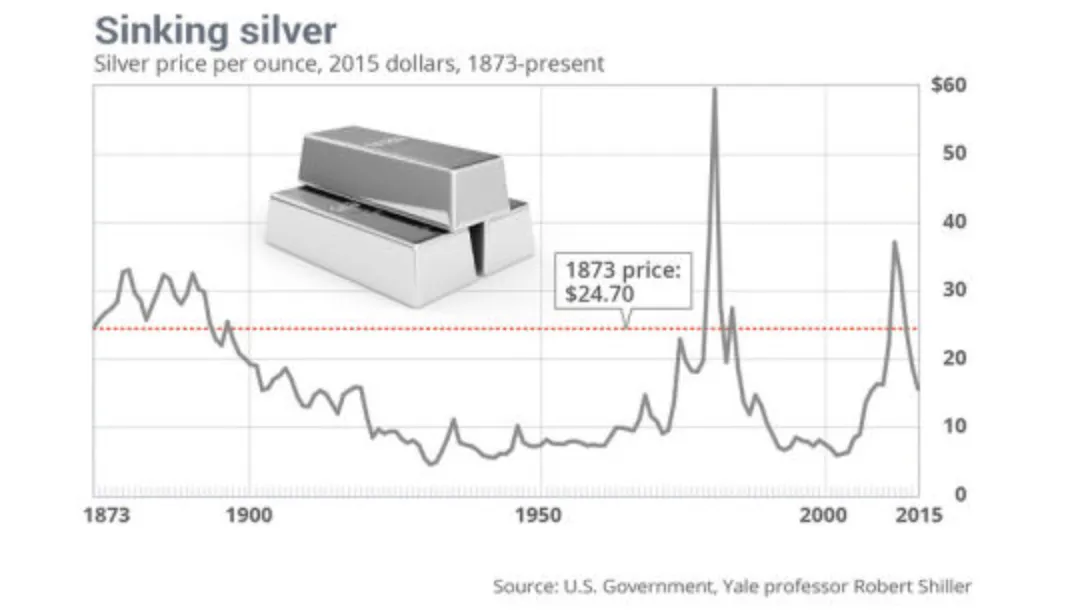 在这一过程中,传统的金银比价(约15-16:1)被彻底打破,到19世纪末,这一比率飙升至30:1甚至更高。白银的价格一路下跌,从19世纪70年代初的约1.3美元/盎司,跌至世纪末的0.6美元/盎司以下。