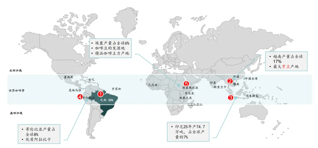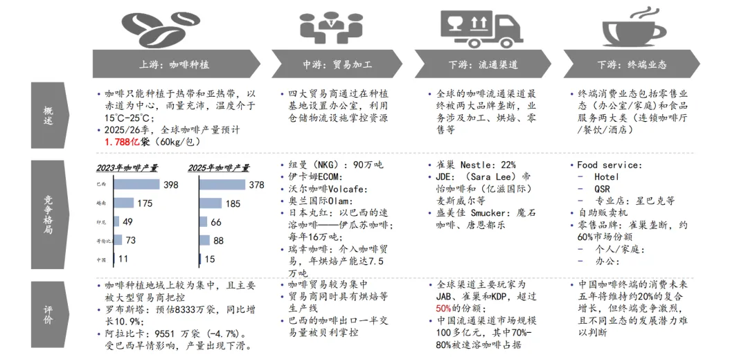 上游种植被巴西、越南等五大产区主导,占全球产量超70%;咖啡豆以阿拉比卡(占70%-80%)和罗布斯塔拼配为主,兼顾风味与成本。