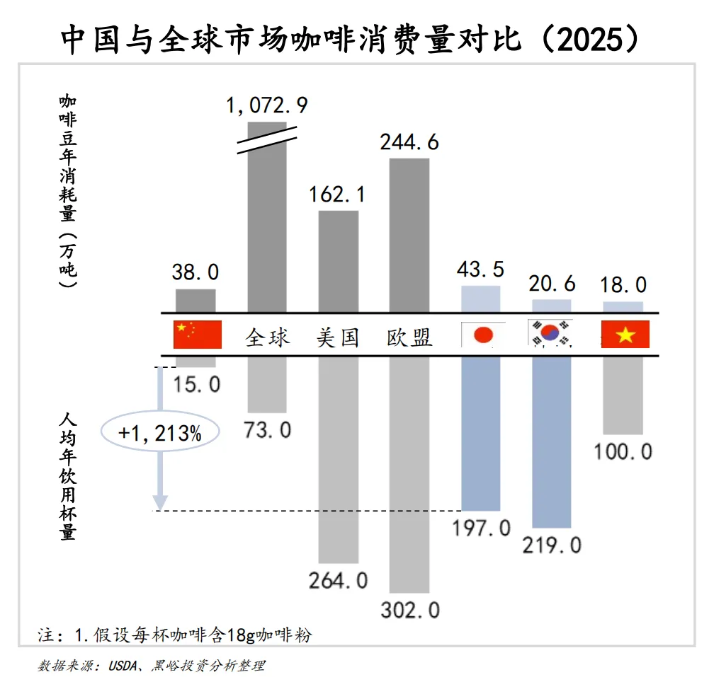中国目前人均年咖啡消费量仅15杯,远低于全球平均的170杯,与日韩的300杯相比差距更大,市场增长空间依然广阔。