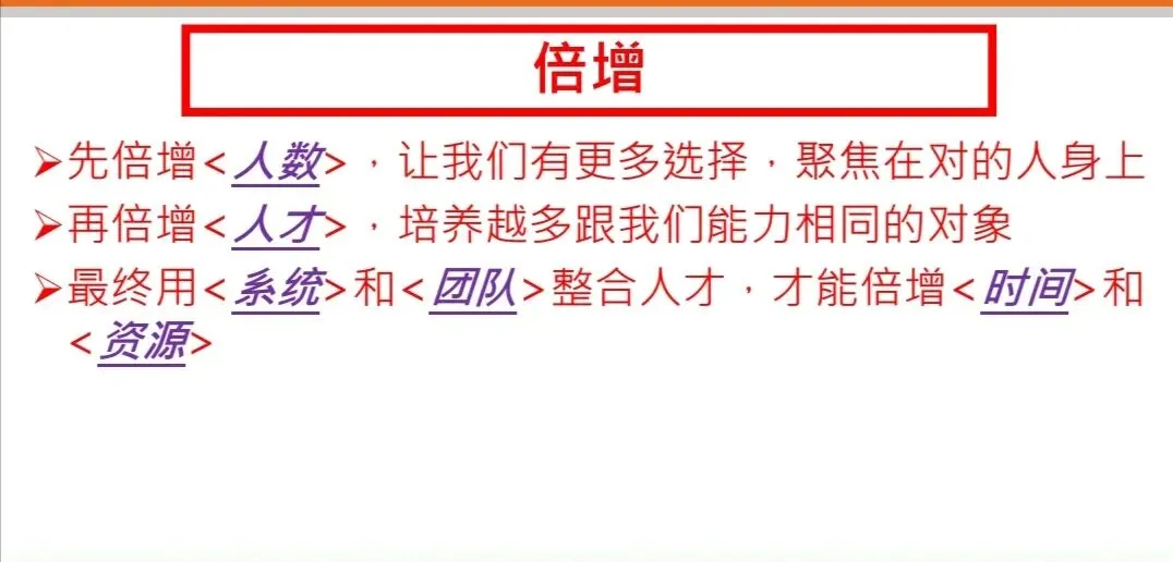 而人才是管道的关键,但并非所有人都是人才。我们要先求量变再求质变:先倍增人数(这是一切的起点),再从大量人数中筛选出“对的人”。