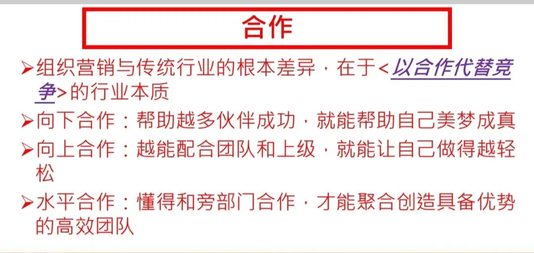 向上合作,无论你发展得多好,都别忘了:上级老师的经验永远比你丰富,团队的协助与资源,需服从核心领导人下发的指令。比如朱总制定的战略,经团队核心层拆解后会转化为可执行的战术,我们只需配合落实即可——这是必须遵守的原则,不管你收入多高、团队多大,都不能忘记:是上级老师和团队资源让你成长,就像“吃着他们的奶嘴长大”,永远不能“断奶”。