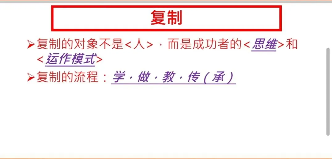 什么是复制?刚才提过,能帮我们少走弯路、避开坑的动作就是复制,但复制的对象不是人,而是成功的思维和运作模式。所以我们向老师或团队大领导人学习时,核心是学他们的思维方式和运作模式——简单说,就是他们如何思考、判断问题,以及面对和处理问题的方式。