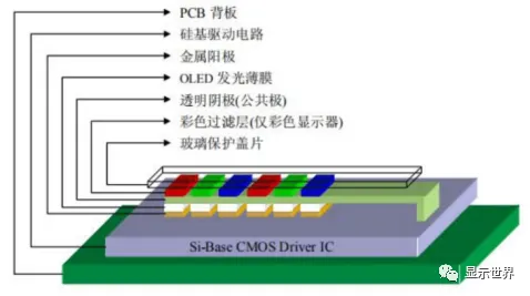 硅基OLED(又称:OLEDoS、Micro-OLED),是以单晶硅作为集成式驱动背板而制作的前沿OLED显示器件。其主要工艺是将有机发光器件制作在已集成视频信号处理和像素驱动阵列的单晶硅集成电路芯片上,并为每个像素配备输出电流可控的CMOS晶体管和电荷存储电容,从而实现有机发光器件与CMOS电路相结合的技术。