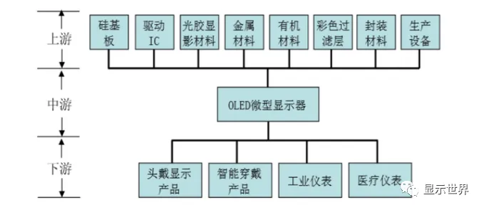 硅基OLED产业链包含上游原材料,中游OLED面板制造以及下游OLED应用,其中上游包括硅基板、驱动IC、光胶显影材料、封装材料等;中游为硅基OLED微显示器面板的制造;下游则是各种终端应用产品。