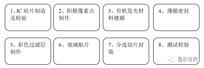硅基OLED的生产,包括阳极像素点制作、有机发光材料镀膜、薄膜密封、彩色过滤层制作、玻璃贴片、分选切片封装等工艺流程。