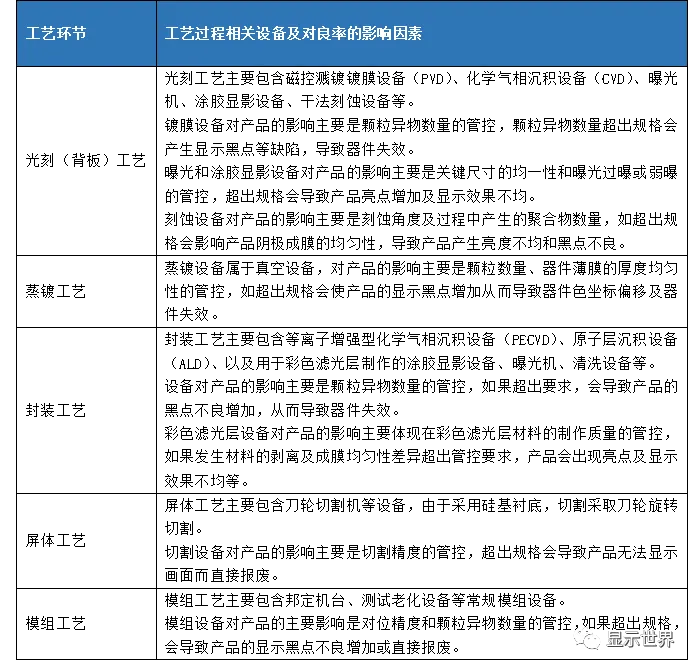 表 2硅基OLED主要工艺环节及设备对良率的影响