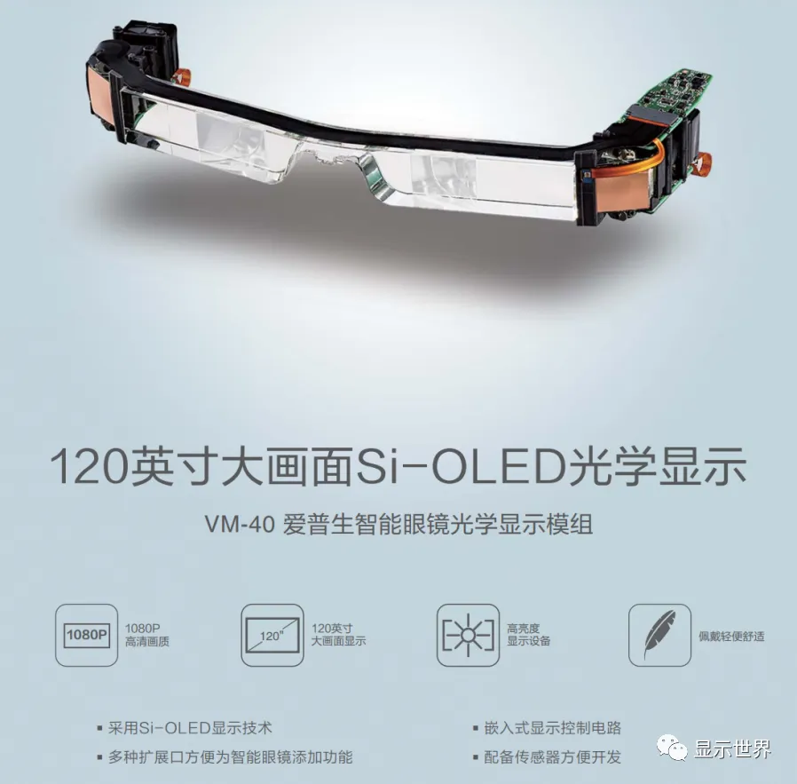 爱普生在OLED相关技术上有近20年的研究,已推出了多款搭载爱普生硅基OLED的智能眼镜。Epson推出的VM-40 AR光学模组搭载0.453英寸1920×1080的硅基OLED屏。