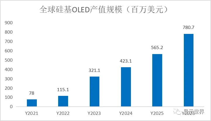 受益于AR等市场的兴起,硅基OLED产业在未来几年将迎来高速成长期。据Omdia的预测数据,到2026年全球硅基OLED产值可超过7.8亿美元。