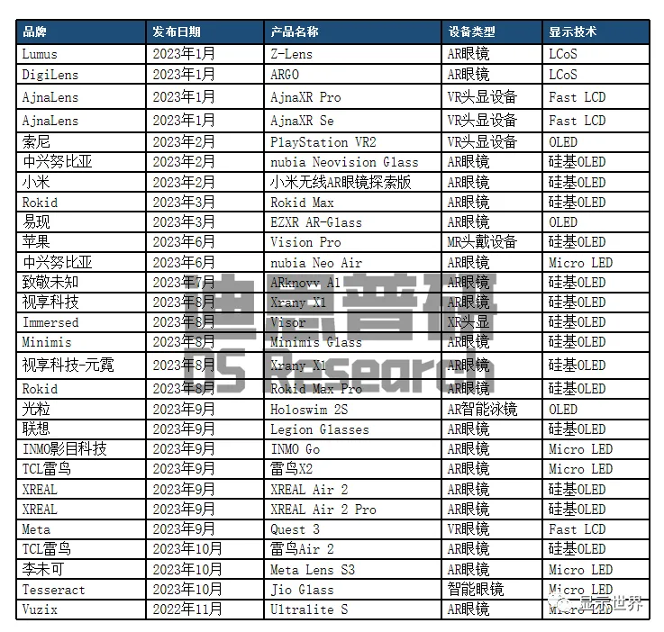 2015年10月,索尼宣布将半导体、电池及存储媒体业务独立出来成立半导体解决方案公司,其下属熊本技术中心负责OLED微型显示器相关业务。SONY于2011年发布了其首款0.5英寸XGA(1024×768)OLED微型显示器产品,并应用于其同品牌的A77、A65、NEX-7、NEX-5N等4款相机产品作为电子取景器用途。2014年,SONY推出了0.23英寸nHD+(640×400)微型显示器,主要用于可穿戴设备,已应用于其同品牌的智能眼镜产品;其720P的微型显示器已应用于ODG公司的AR眼镜。2023年6月,苹果发布首款头显产品——Apple Vision Pro,索尼为Apple Vision Pro供应WOLED+CF方式的硅基OLED屏。2023年8月,索尼宣布将发布一款大尺寸、高分辨率的1.3英寸OLED微型显示器ECX344A,其4K分辨率有助于重建更真实的空间显示。目前,XREAL Air 2 Pro智能AR眼镜、Rokid Max AR眼镜、小米AR眼镜等产品均搭载索尼硅基OLED屏。