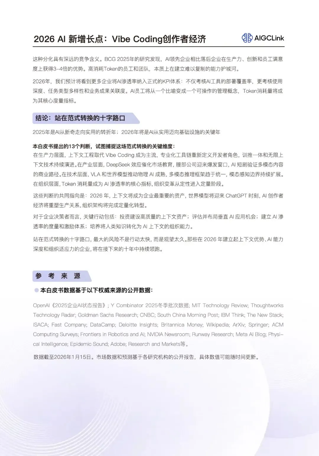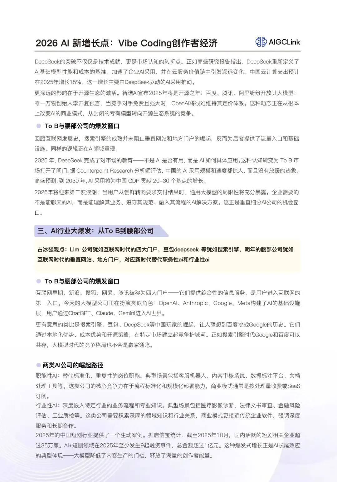 DeepSeek以低成本突破撼动了“算力换智能”的旧范式,开启平民化AI时代;投资重心正从基础模型转向垂直应用(如医疗AI融资超180亿美元),表明市场追求可衡量的商业回报;而95%的试点失败率与FDE需求暴涨,则揭示了“技术供给”与“业务需求”间的核心矛盾,专业化、场景化的“腰部公司”与“超级个体”(OPC)将成为填平鸿沟的关键力量。